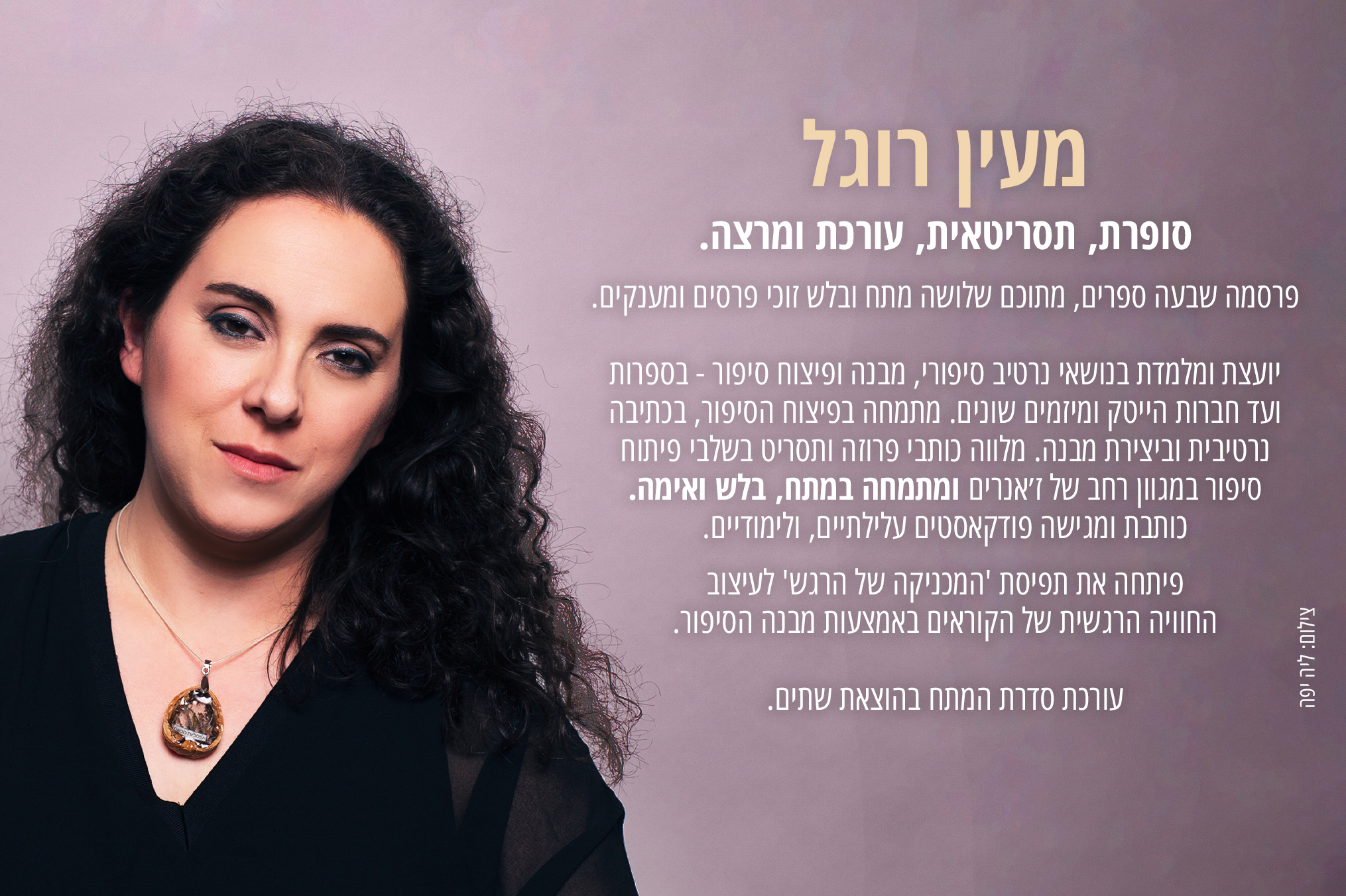 קורס מעשי ומעמיק לכותבים וכותבות בז'אנר הבלש והמתח בהנחיית הסופרת מעין רוגל, במהלך שמונה מפגשים נדבר נלמד ונתרגל את המלאכה העדינה והקפדנית של טווית תעלומה ופשע, והפרימה הקפדנית שלה על ידי גיבור הסיפור. כתיבה בז'אנר המתח והבלש דורשת עבודה קפדנית של ניהול מידע, דמויות ומבנה, ובמהלך שמונת מפגשי הקורס נדבר על כלים מעשיים ונגישים כדי לעשות את העבודה היטב.